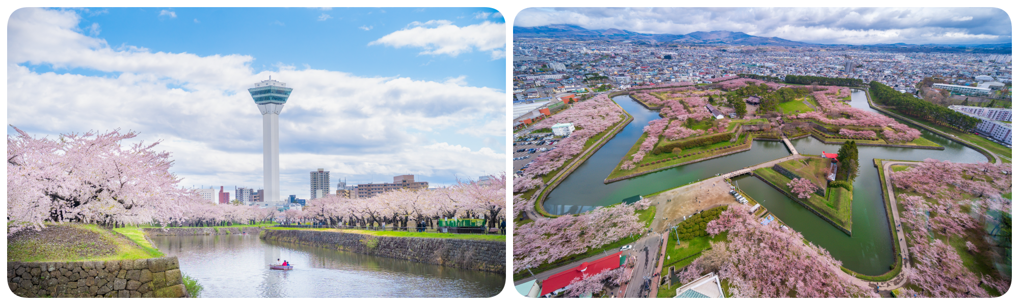 จุดชมวิวซากุระที่โดดเด่นและมีเอกลักษณ์ไม่เหมือนใคร เมื่อขึ้นไปยืนบนจุดชมวิวของหอคอยโกเรียวกาคุ คุณจะมองเห็นป้อมปราการรูปดาวห้าแฉกขนาดใหญ่ที่ถูกแต่งแต้มด้วยสีชมพูของดอกซากุระจนเต็มพื้นที่ สถาปัตยกรรมตะวันตกที่โอบล้อมด้วยธรรมชาติอันอ่อนช้อยนี้ เป็นความมหัศจรรย์ที่ต้องมาเห็นด้วยตาตัวเองสักครั้ง