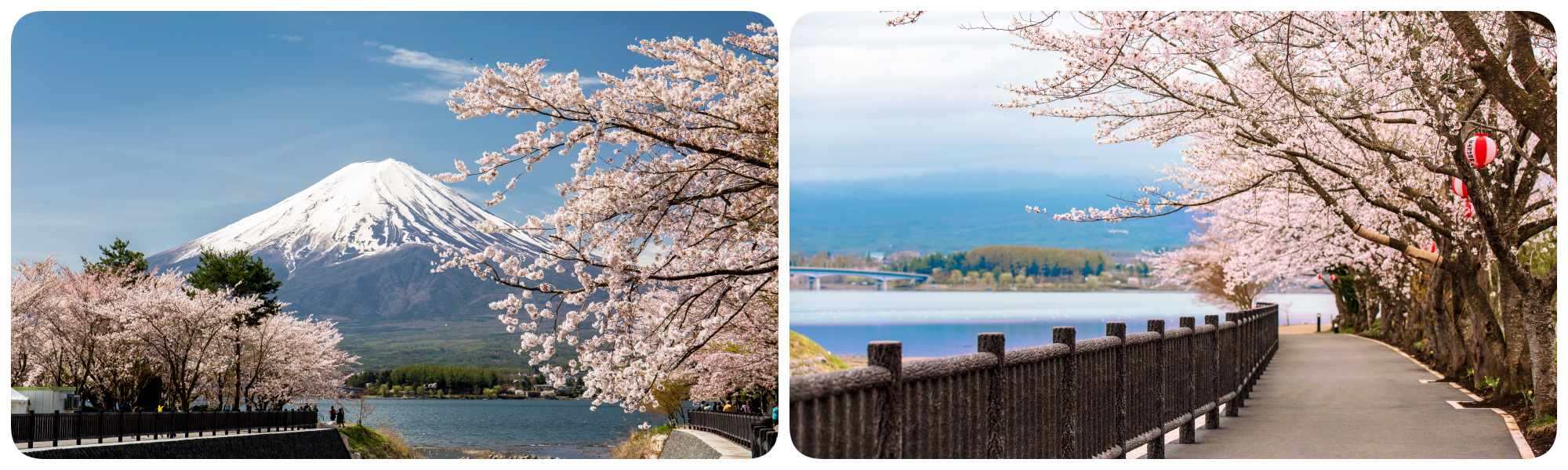 ปิดท้ายด้วยภาพจำของญี่ปุ่นที่สมบูรณ์แบบที่สุด ดอกซากุระสีชมพูสดใสชูช่ออย่างสง่างาม โดยมีทัศนียภาพอันยิ่งใหญ่ของภูเขาไฟฟูจิตระหง่านอยู่เบื้องหลัง เป็นองค์ประกอบที่ธรรมชาติรังสรรค์ขึ้นอย่างวิจิตรบรรจง ราวกับภาพวาดสีน้ำมันเฟรมใหญ่ที่งดงามจนอยากหยุดเวลาเอาไว้