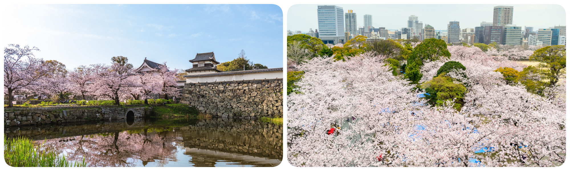 ซากุระกว่า 1,000 ต้นที่เบ่งบานโอบล้อมซากปรักหักพังของปราสาทฟุกุโอกะโบราณ อบอวลไปด้วยกลิ่นอายของประวัติศาสตร์ที่เงียบสงบและลึกซึ้ง ยามค่ำคืนที่มีการประดับไฟ แสงเงาที่ทาบทับลงบนแนวกำแพงหินและช่อดอกซากุระ จะสร้างบรรยากาศที่โรแมนติกและดูลึกลับน่าค้นหา