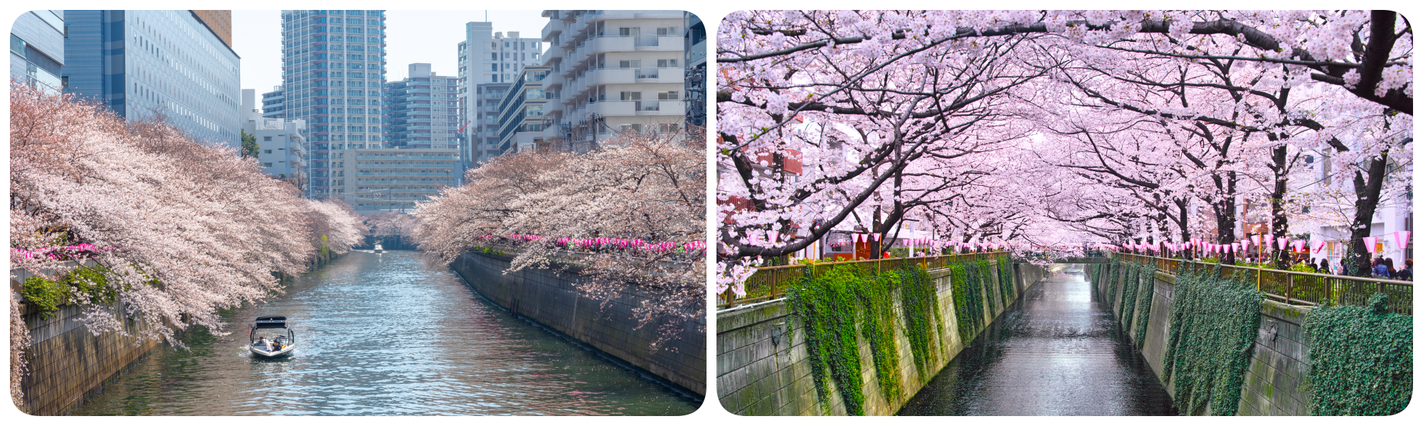 ที่สุดของความโรแมนติกใจกลางเมือง ต้นซากุระที่ปลูกเรียงรายเลียบสองฝั่งคลองจะโน้มกิ่งเข้าหากันจนกลายเป็น “อุโมงค์ซากุระ” สีชมพูอ่อน ภาพของกลีบดอกไม้ที่ร่วงหล่นลอยไปตามผิวน้ำ พร้อมกับร้านกาแฟชิคๆ ที่ตั้งอยู่ริมทาง เป็นเสน่ห์ที่ทำให้ใครต่อใครต่างตกหลุมรัก