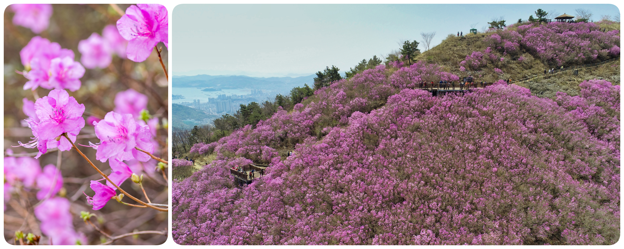 หากพ็อดกตคือความอ่อนหวาน “ดอกจินดัลแร” หรือ “ดอกอาซาเลีย” ก็คือความหลงใหลที่ร้อนแรง ดอกไม้สีชมพูอมม่วงหรือสีบานเย็นนี้มักจะบานสะพรั่งอยู่ตามไหล่เขา เปลี่ยนภูเขาที่เคยแห้งแล้งให้กลายเป็นพรมสีชมพูผืนยักษ์ เทศกาลดอกจินดัลแรที่ภูเขาฮวางแมซาน (Hwangmaesan) หรือภูเขากังฮวา (Ganghwa) คือจุดหมายปลายทางที่จะทำให้คุณต้องตะลึงกับความยิ่งใหญ่ของธรรมชาติ ราวกับเปลวเพลิงสีชมพูที่ลุกโชนท่ามกลางสายหมอกยามเช้า