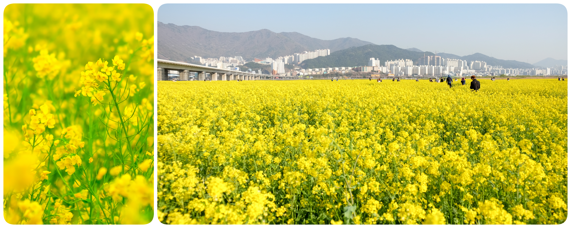 ปิดท้ายด้วยความสดใสแบบไร้ขีดจำกัดกับ “ดอกยูแช” หรือ “ดอกคาโนล่า” (Canola Flower) ทุ่งดอกไม้สีเหลืองเรืองรองที่ทอดยาวสุดลูกหูลูกตา โดยเฉพาะบนเกาะเชจู (Jeju Island) ที่ซึ่งทุ่งดอกยูแชสีเหลืองสดตัดกับสีฟ้าครามของน้ำทะเลและท้องฟ้า ท่ามกลางฉากหลังของภูเขาไฟฮัลลาซาน ก่อเกิดเป็นทัศนียภาพที่งดงามเกินกว่ากล้องถ่ายรูปใดๆ จะบันทึกความรู้สึกตื้นตันใจนั้นไว้ได้หมด